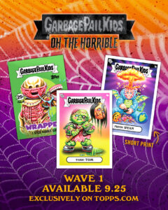 Is that pumpkin spice I smell? It’s every GPK collector’s favorite time of year, and that means the tradition of horror themed sets. Today Topps began teasing the next six week online series 2025 Garbage Pail Kids Oh the Horror-ible. The weekly sets will once again feature 10 cards, 5 new gags with a/b versions. Artist Brent Engstrom will handle art for the first four weeks, while David Gross does the final two sets. For the first time there will also be a weekly short print insert of a classic GPK character in costume, with artwork done by Smokin Joe McWilliams. Each set will also come with a Wrapper card. The first set goes on sale on Topps.com tomorrow, 9/25/25. These won’t be limited, so collectors should get a week to get their purchases in.